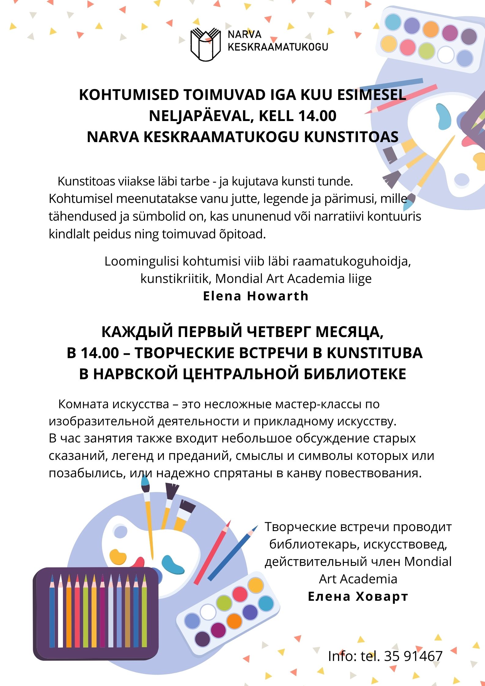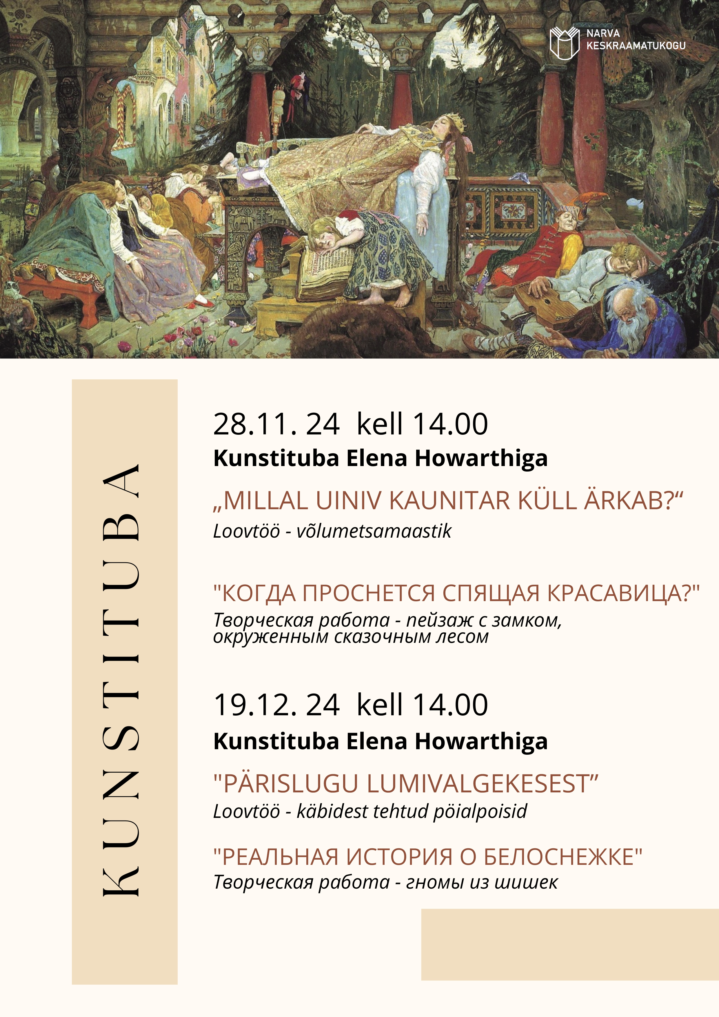 19. detsembril kell 14.00 toimub Narva Keskraamatukogus loominguline kohtumine kunstitoas. Selle kohtumise teemaks on "Tõeline lugu Lumivalgekesest." Mõtleme sellele, et lugu Lumivalgekesest on kohati väga tõsine, kus on kuri ja kade kasuema ning isegi mürgitatud õun. Selle legendi rääkis vendadele Grimmidele Kasseli linna põhigümnaasiumi õpetaja. Ja kuigi elu pole muinasjutt, juhtub selles mõnikord erakordseid sündmusi. Headus saab võidu kurjuse üle.