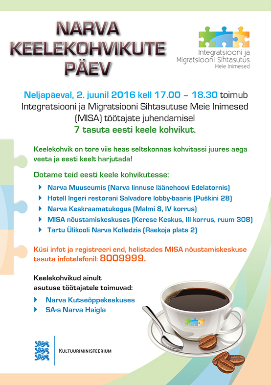 Neljapäeval, 2. juunil 2016 kell 17.30 - 18.30 toimub Integratsiooni ja Migratsiooni Sihtasutuse Meie Inimesed (MISA) töötajate juhendamisel 7 tasuta eesti keele kohvikut. Keelekohvik on tore viis heas seltskonnas kohvitassi juures aega veeta ja eesti keelt harjutada!