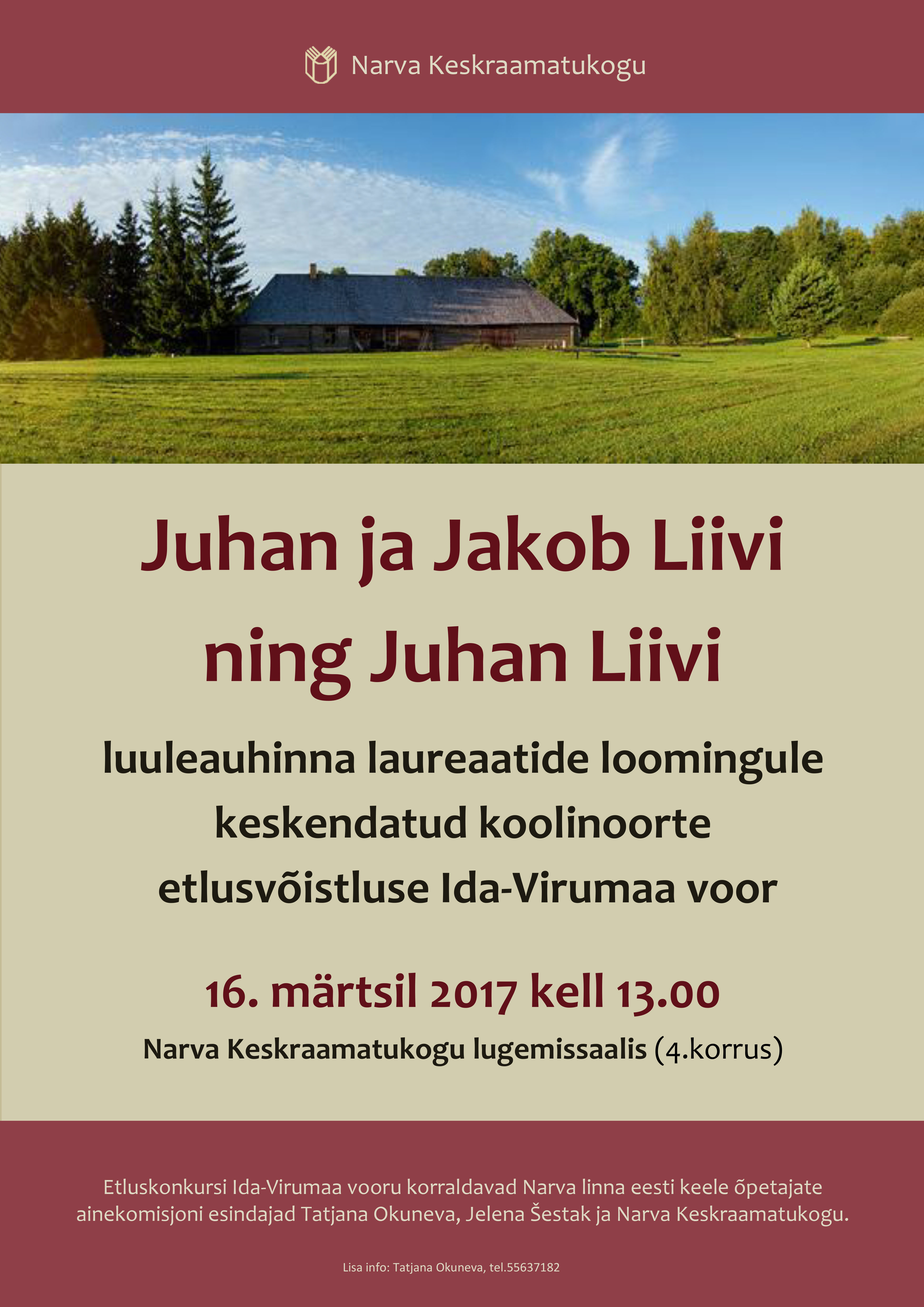16. märtsil 2017 algusega kell 13.00 toimub Narva Keskraamatukogus Emakeelepäevale pühendatud Juhan ja Jakob Liivi ning Juhan Liivi luuleauhinna laureaatide loomingule keskendatud koolinoorte etlusvõistluse Ida-Virumaa voor.
