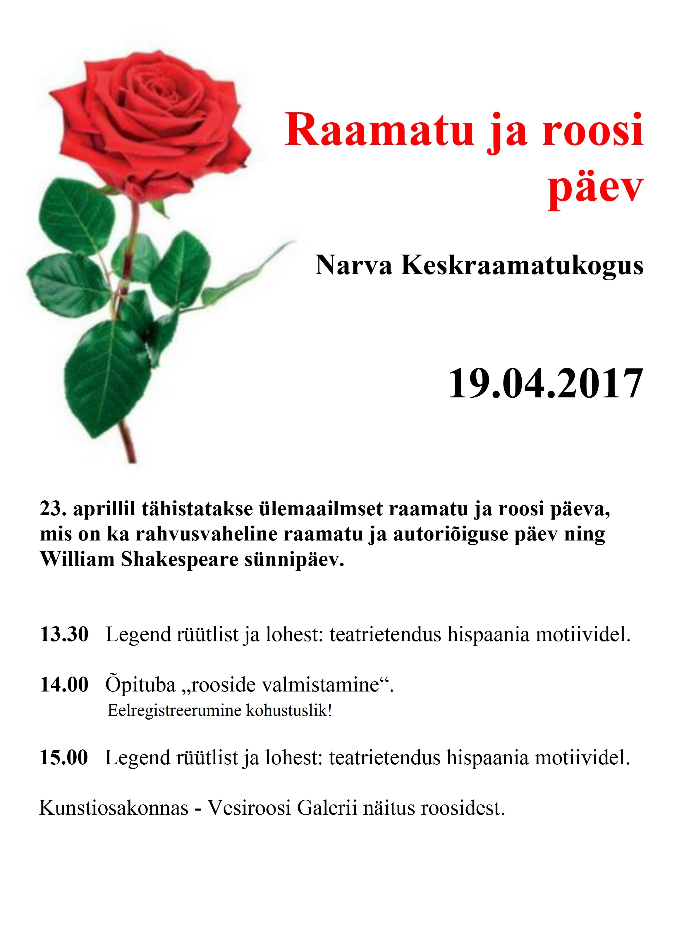23. aprillil tähistatakse ülemaailmset raamatu ja roosi päeva, mis on ka rahvusvaheline raamatu ja autoriõiguse päev ning William Shakespeare sünnipäev.