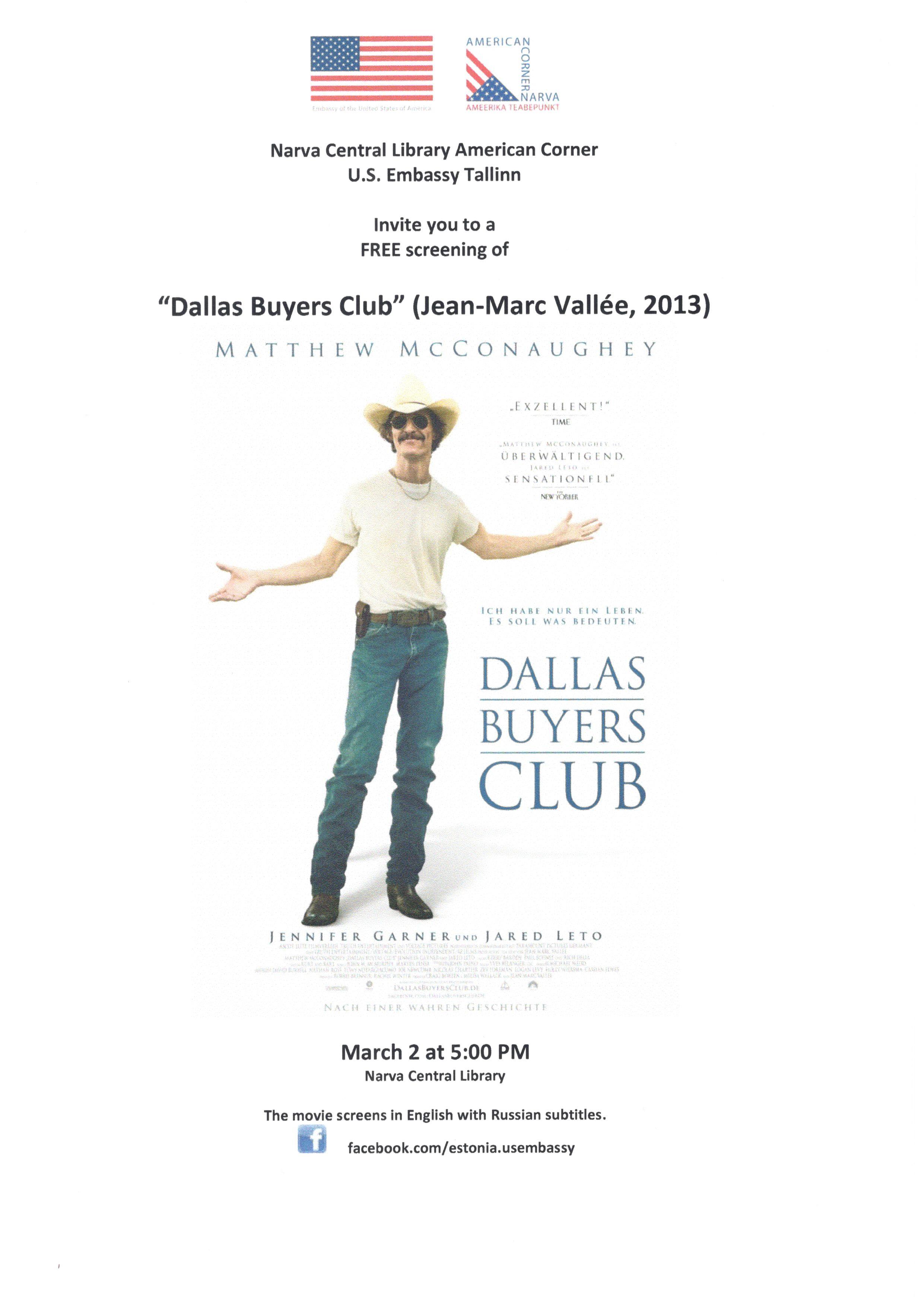 “Dallas Buyers Club” directed by Jean-Marc Vallée (2013, 117 minutes). Monday, March 2, at 5:00 PM at Narva Central Library (Malmi 8).