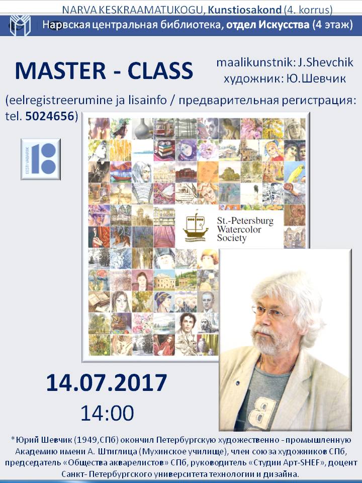 Мастер-класс состоится в отделе Искусства (4 этаж Нарвской центральной библиотеки) 14 июля в 14 часов. Предварительная регистрация обязательна, тел. 5024656.