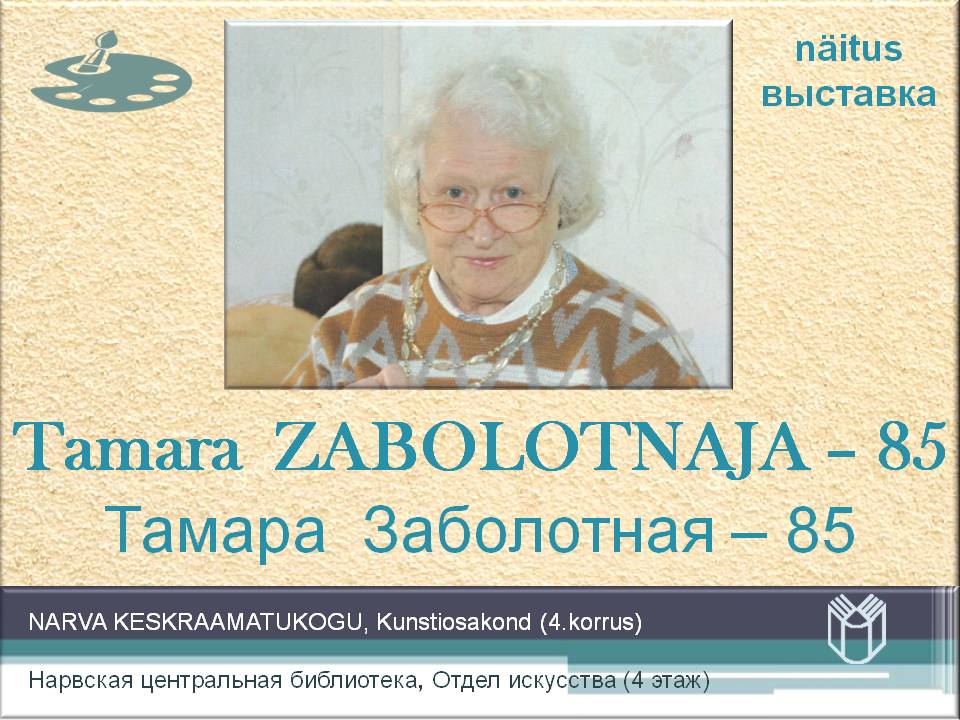 Тамара Заболотная – 85: выставка Нарвская центральная библиотека, Отдел искусства (4 этаж) Нарвитянка Тамара Заболотная (1932-2013) — художник-самоучка, за кисть взялась, выйдя на пенсию. Тамара работала медсестрой, а любовь к искусству проявляла как зритель. Позже художница освоила акварельную технику, пастель и маслянные краски.