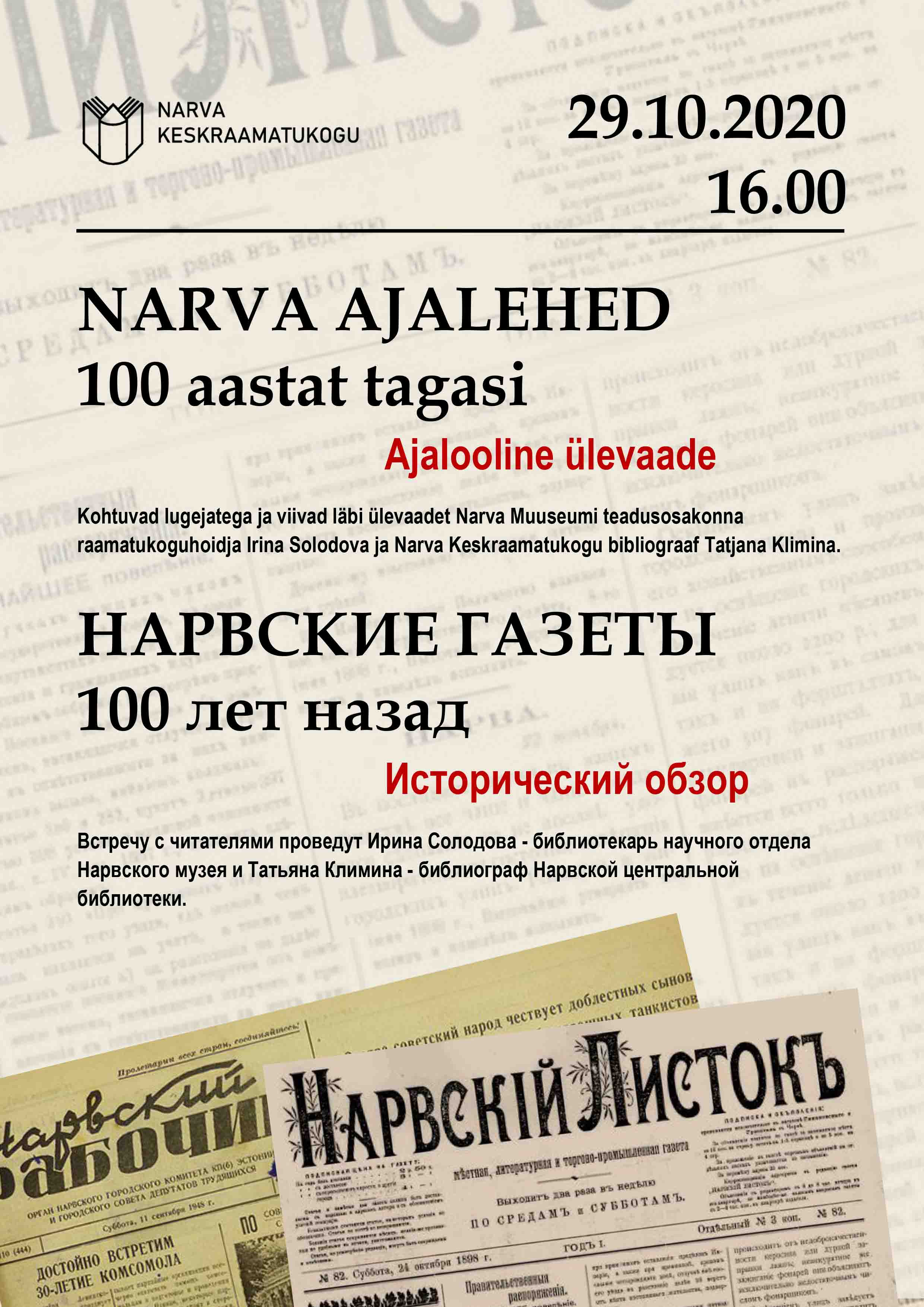 29 октября 2020 года в 16.00 Нарвская центральная библиотека приглашает на исторический обзор «Нарвские газеты 100 лет назад».