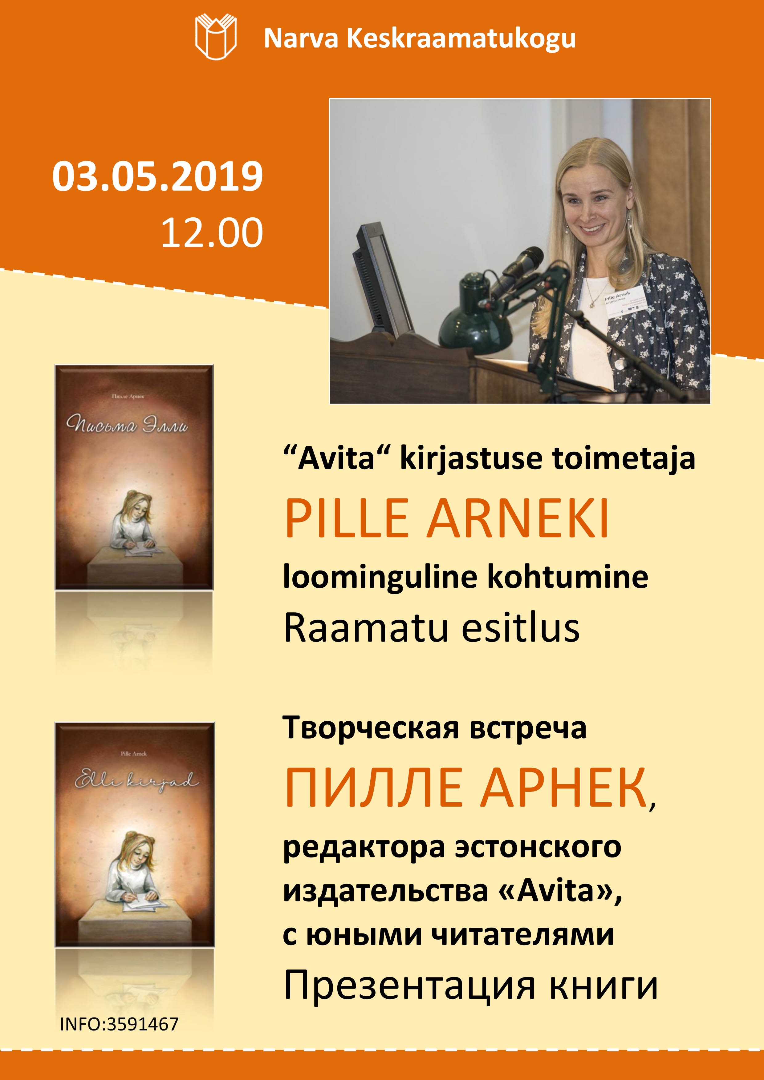 3 мая, в пятницу, в 12.00, в Нарвской центральной библиотеке состоится творческая встреча Пилле Арнек, редактора эстонского издательства «Avita», с юными читателями. Во встрече примут участие школьники Пяхклимяэской гимназии.