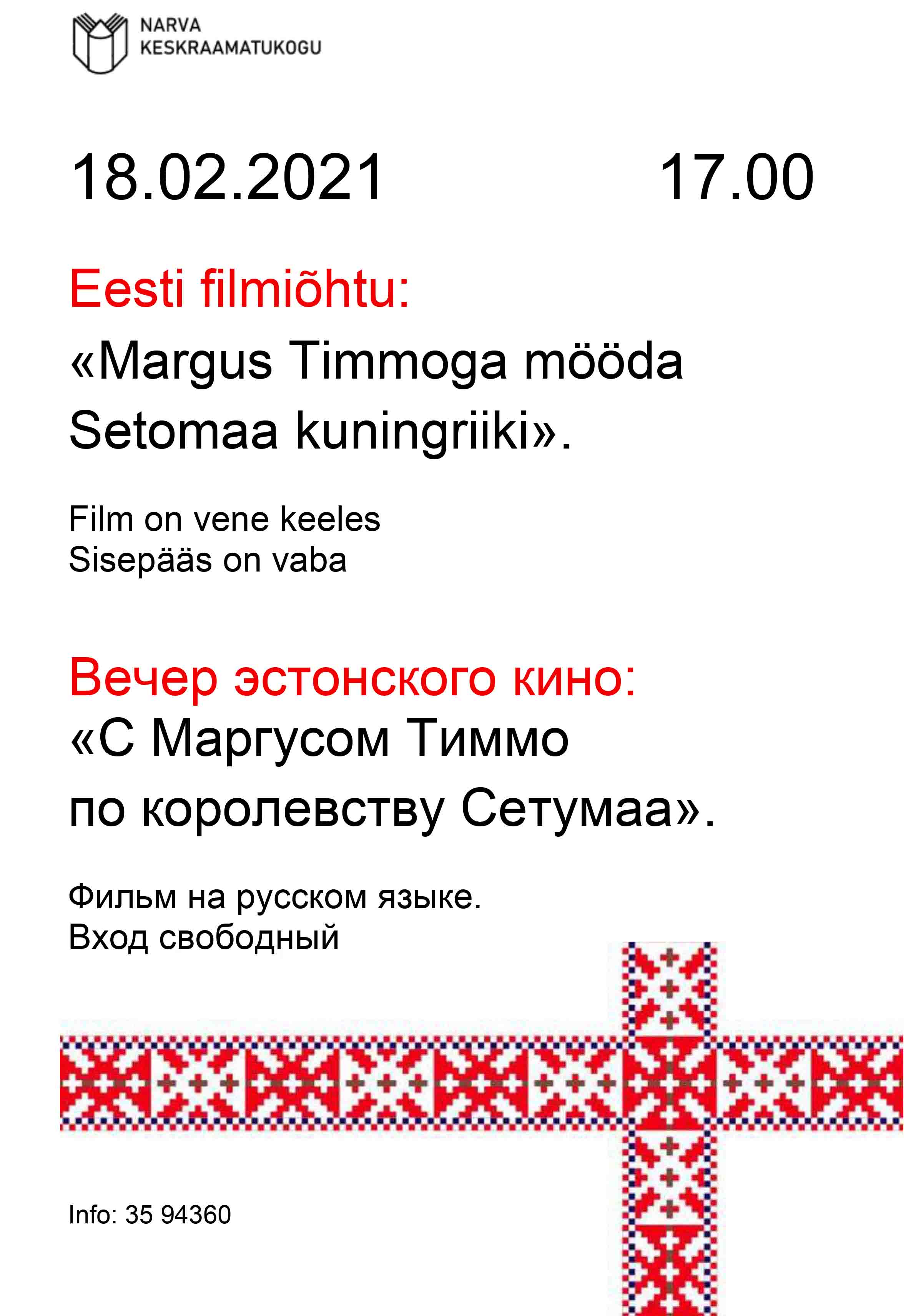 В рамках празднования Дня независимости Нарвская центральная библиотека приглашает вас на вечер эстонского кино 18 февраля в 17.00.