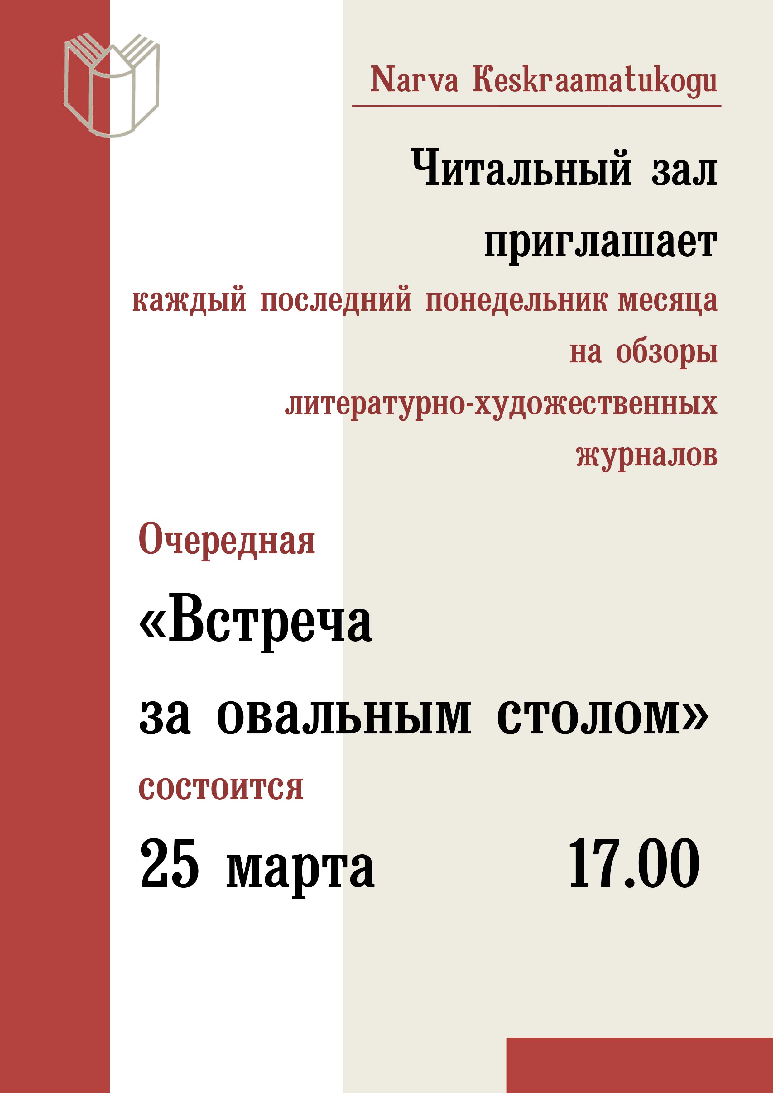25 февраля 2019 в 17.00 в читальном зале состоится очередная «Встреча за овальным столом», на которой будут представлены произведения, напечатанные в первых номерах литературно-художественных журналов 2019 года.