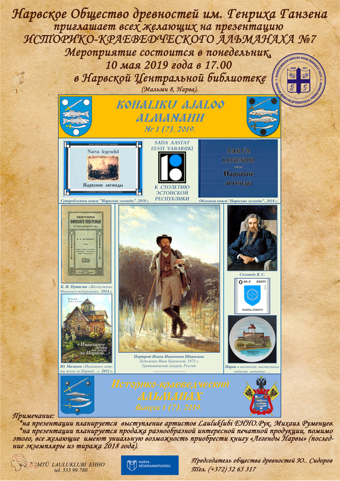 Нарвское общество древности им. Генриха Ганзена приглашает всех желающих 10 мая 2019 года в 17.00 в Нарвскую центральную библиотеку (Мальми 8, Нарва) на презентацию подготовленного обществом седьмого номера нарвского историко-краеведческого альманаха!
