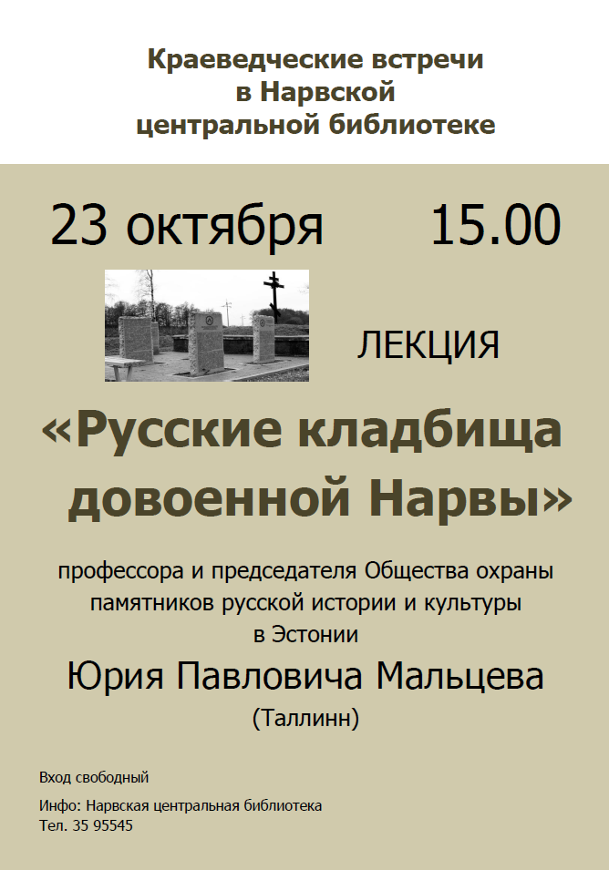 В пятницу, 23 октября, в 15.00 Нарвская центральная библиотека приглашает всех интересующихся историей родного края на лекцию «Русские кладбища довоенной Нарвы» профессора и председателя Общества охраны памятников русской истории и культуры в Эстонии Юрия Павловича Мальцева (Таллинн).