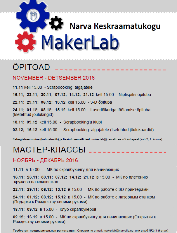 Дополнительная информация и бронирование помещения по тел. 3592415 или tehnika@narvalib.ee