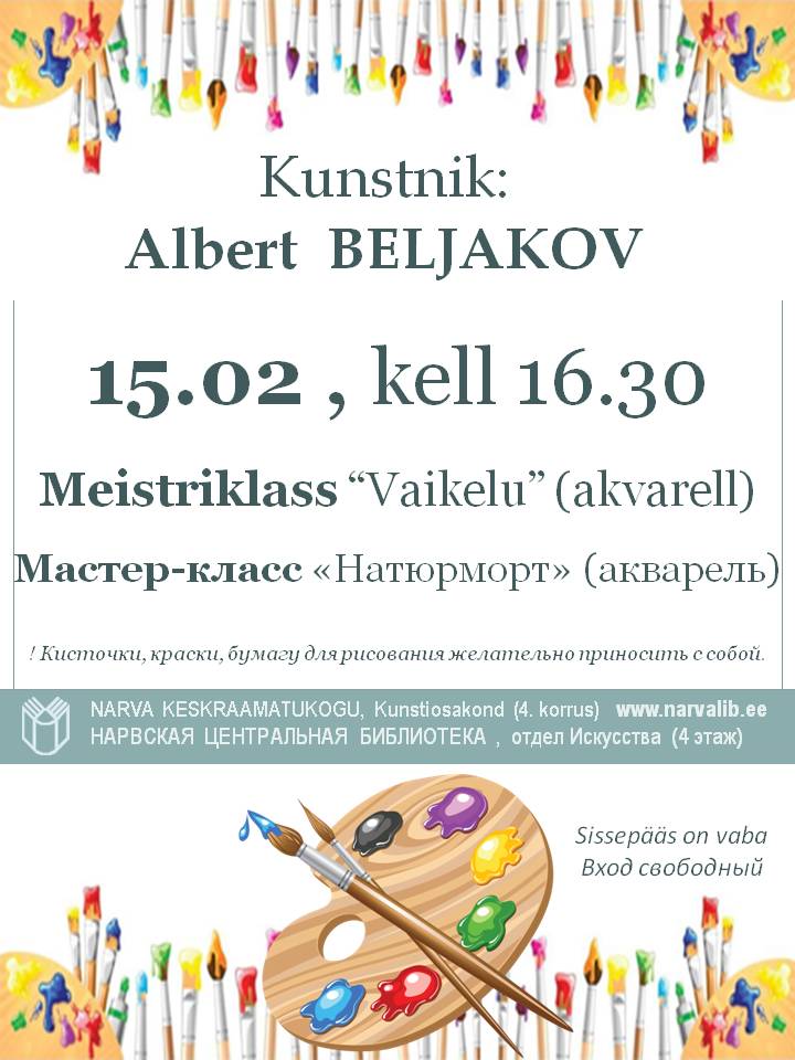 Ждем Вас 15 февраля в 16.30 на 4 этаже Нарвской центральной библиотеки (отдел Искусства).