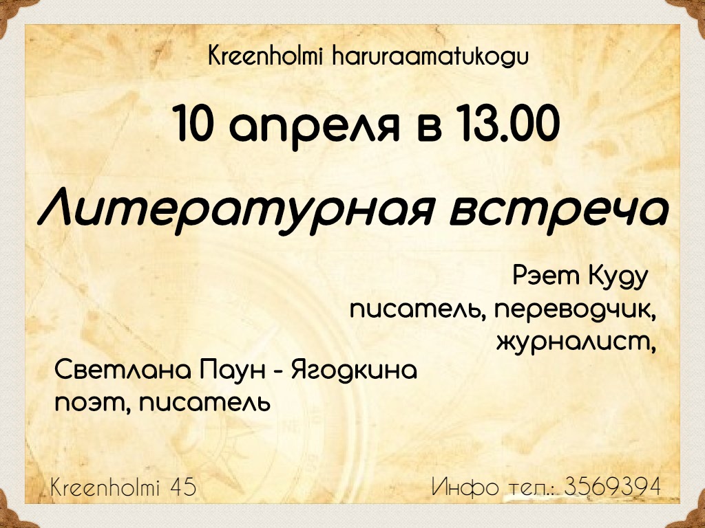 Кренгольская библиотека приглашает вас 10 апреля в 13.00 на "Литературную встречу". На встрече эстонская писательница, журналист и переводчик Рэет Куду расскажет о себе и своем творчестве. Также на встрече поэт Светлана Паун-Ягодкина расскажет о себе и совместном творчестве с Рэет Куду. Мероприятие бесплатное и будет проходить на двух языках (эстонском и русском).