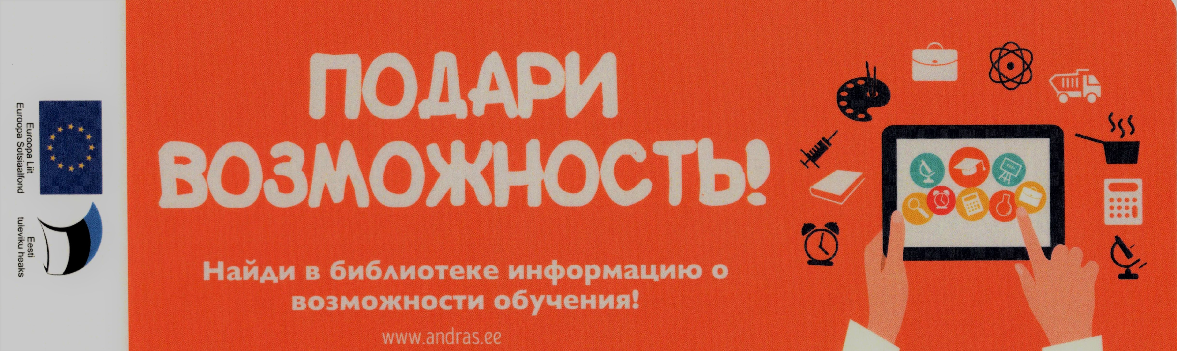 5-15 декабря во всех библиотеках Эстонии проходит акция «Подари возможность», организованная эстонской Ассоциацией преподавателей взрослых ANDRAS. Цель акции – познакомить жителей Эстонии возраста 18+ с различными возможностями обучения.